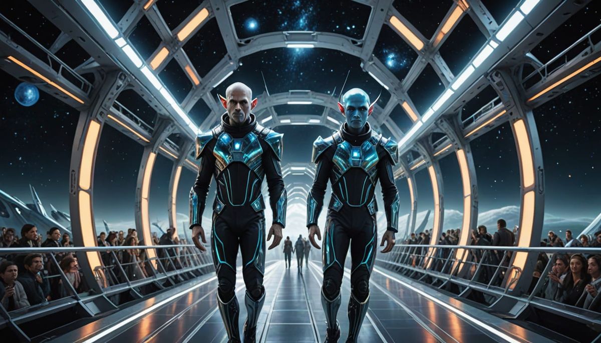 A mesmerizing, otherworldly model showcases avant-garde space fashion on a futuristic catwalk, set against a backdrop of starry space and gleaming spaceships.