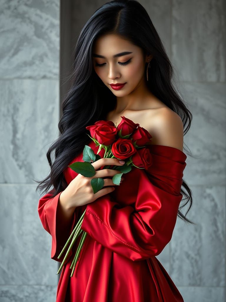 A photorealistic portrait of a woman in an elegant red satin gown, holding a bouquet of roses. Shot with soft side lighting and shallow depth of field for a cinematic feel.