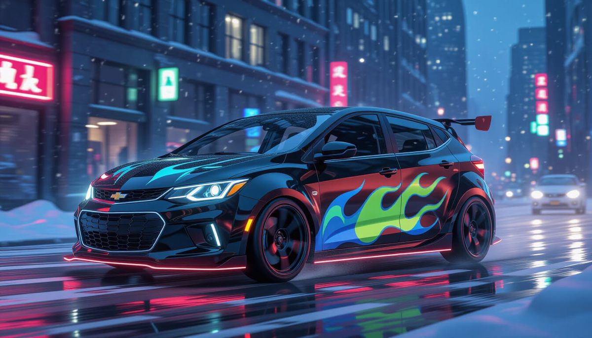 A hyper-realistic image of a customized Chevrolet Aveo drifting through city streets. The car features a black paint job with scale-like flames and red neon lights in a Syd Mead aesthetic.