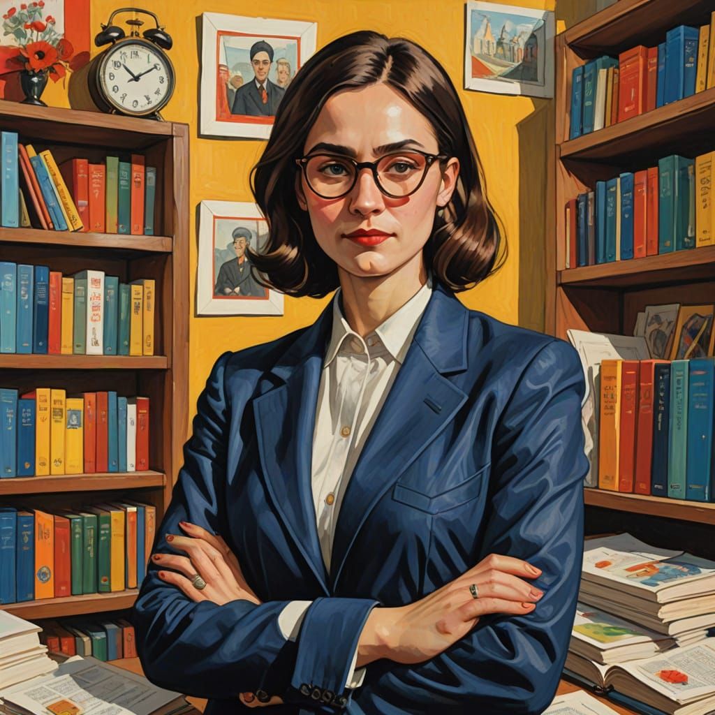 This image shows a modern Russian Lubok-style illustration of a young woman with an ironic smile. The digital painting employs vibrant colors, bold lines, and high contrast in a satirical, graphic novel-inspired aesthetic.