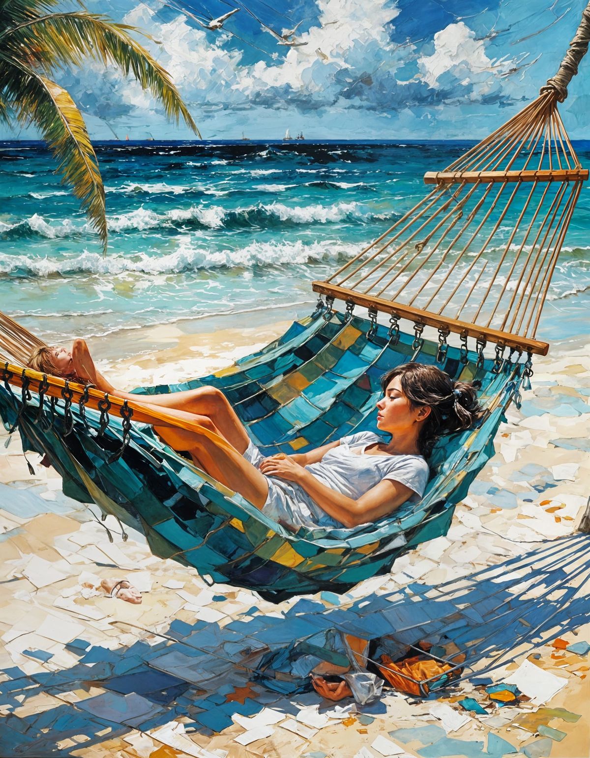 This image depicts a woman resting in a hammock on a serene beach. The artwork features abstract elements, complementary colors, and fine details, reminiscent of classical painting techniques.