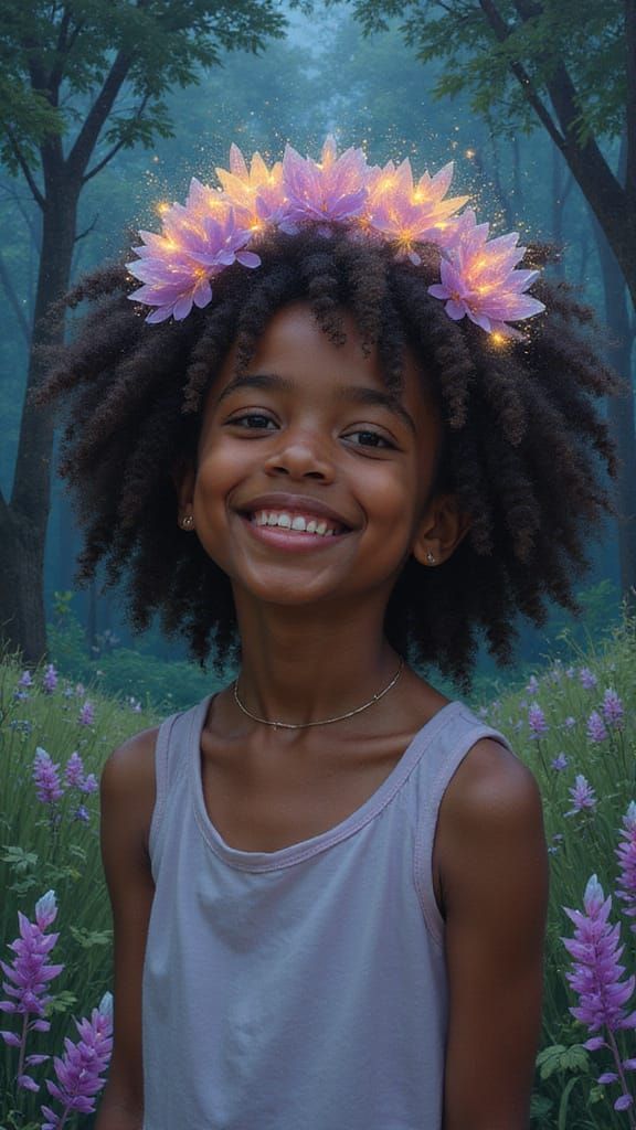 This image shows a happy African American girl with a vibrant crown of glowing flowers. The scene features a mystical grove filled with shimmering equations, rendered with expressive brushwork for a dreamlike quality.