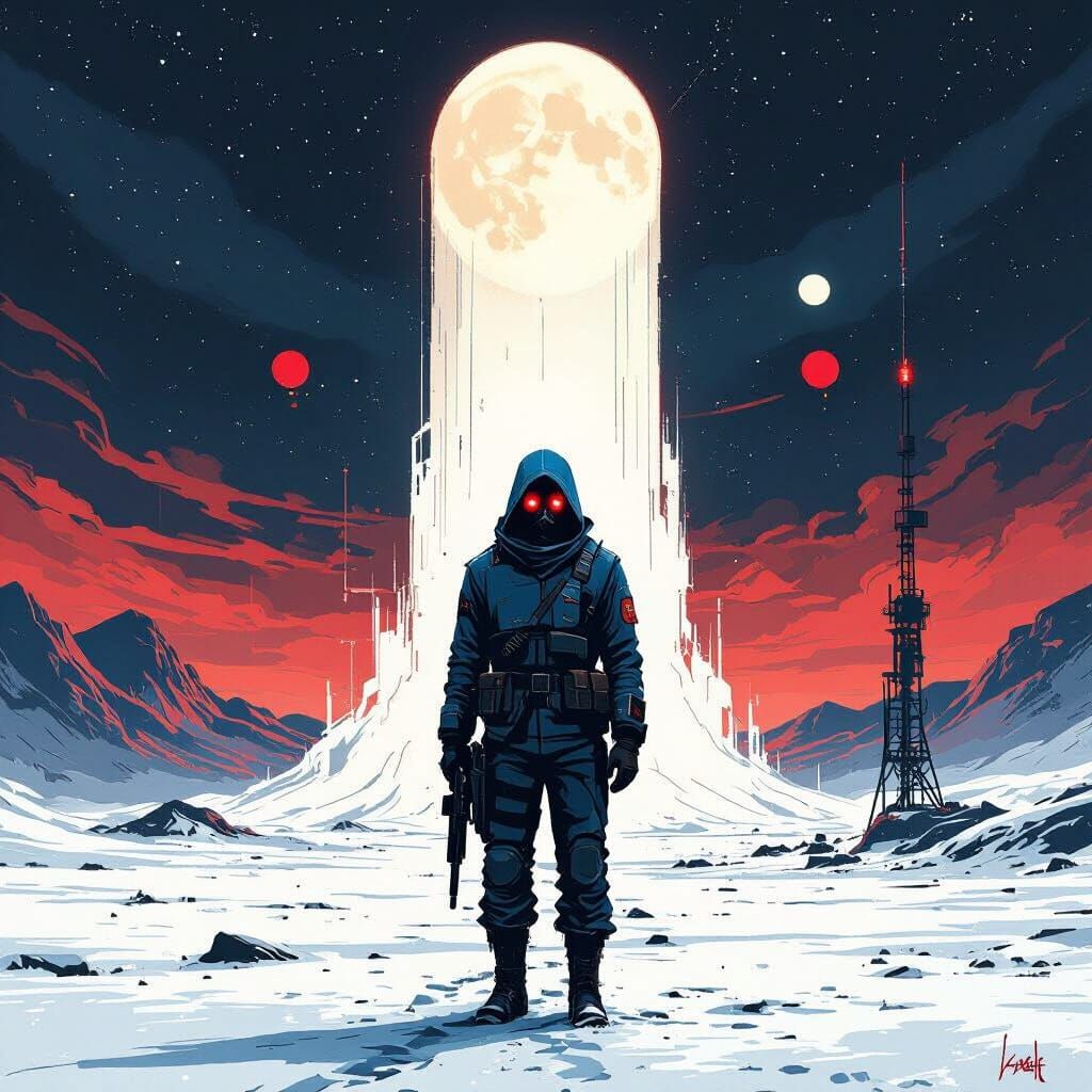 This image shows a grim ex-military figure wearing a dark blue hood and gas mask, with intense red eyes. The artwork features a dystopian atmosphere.