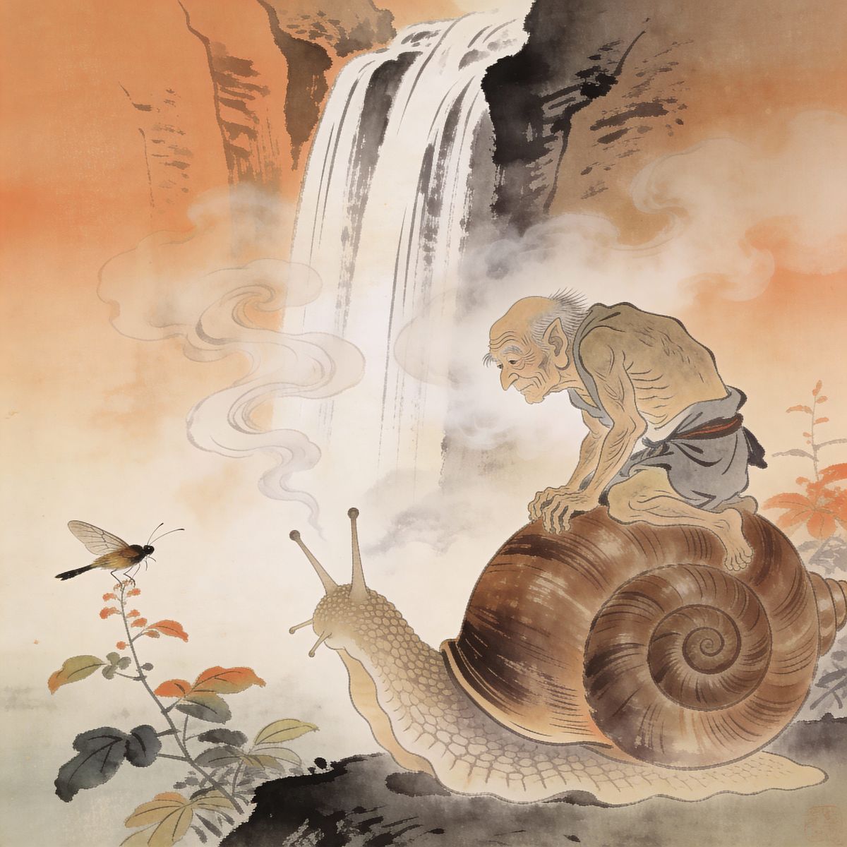 A serene Ukiyo-e style print featuring a gremlin on a giant snail, surrounded by misty waterfalls and soft morning light. Gentle pastel colors create a peaceful, reflective atmosphere.