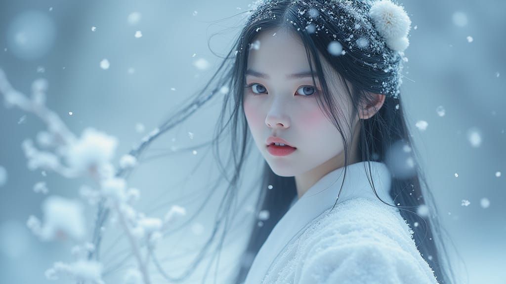 This image captures a serene and enigmatic female figure, blending into the wintry scenery with an aura of frost, her gaze radiating an ethereal luminescence that symbolizes life amidst the harsh beauty of winter.