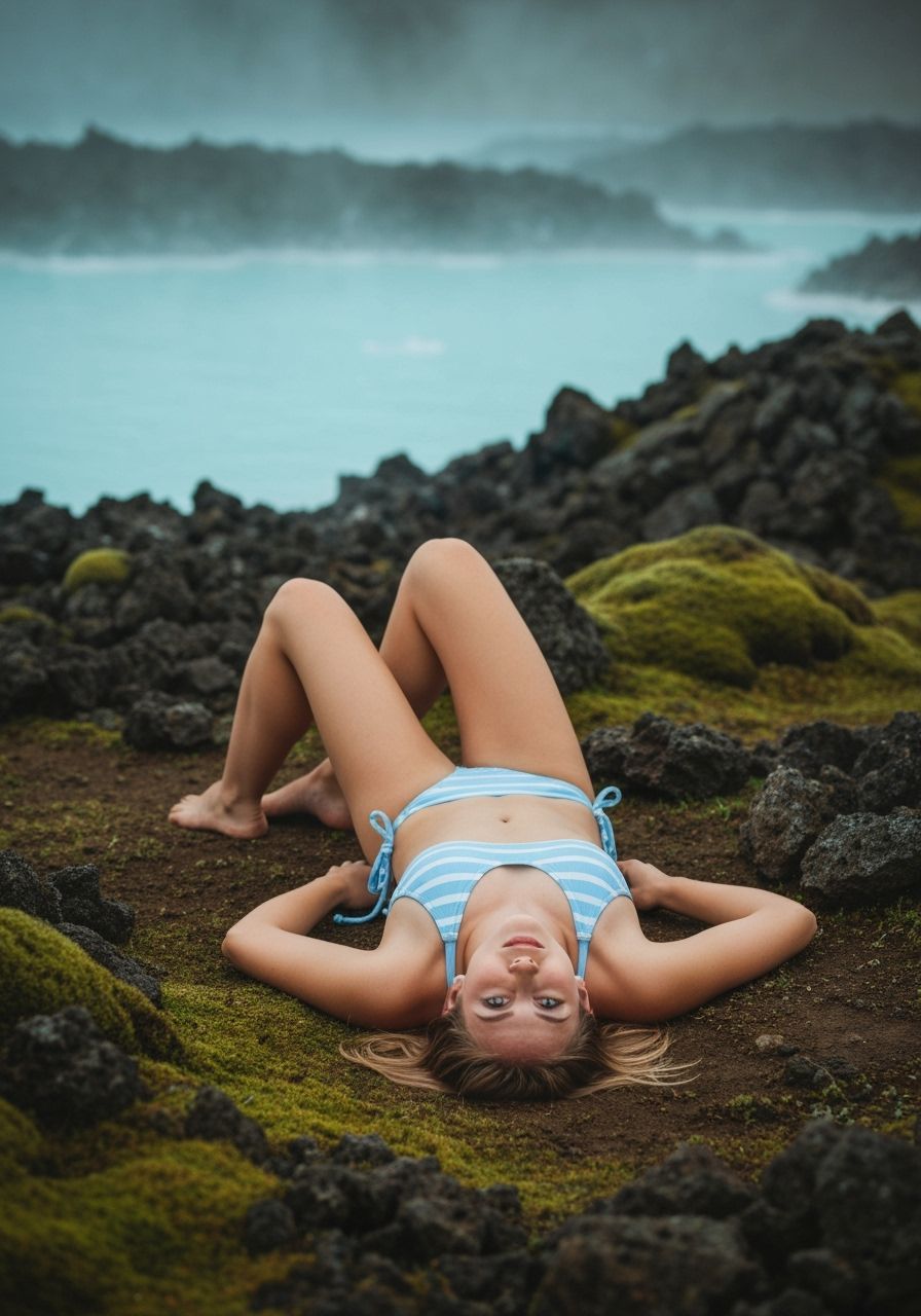 This image shows a young woman in a bikini lounging near Iceland's Blue Lagoon. The photo features shallow depth of field, soft bokeh, and warm, natural lighting, reminiscent of professional travel photography.