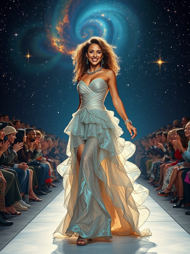 This image shows a woman posing confidently on a starry catwalk, surrounded by a diverse crowd of cheering spectators in intricate, intergalactic attire. Her iridescent, layered gown shines in the starlight, blending futuristic and sci-fi elements in a hyper-realistic scene.
