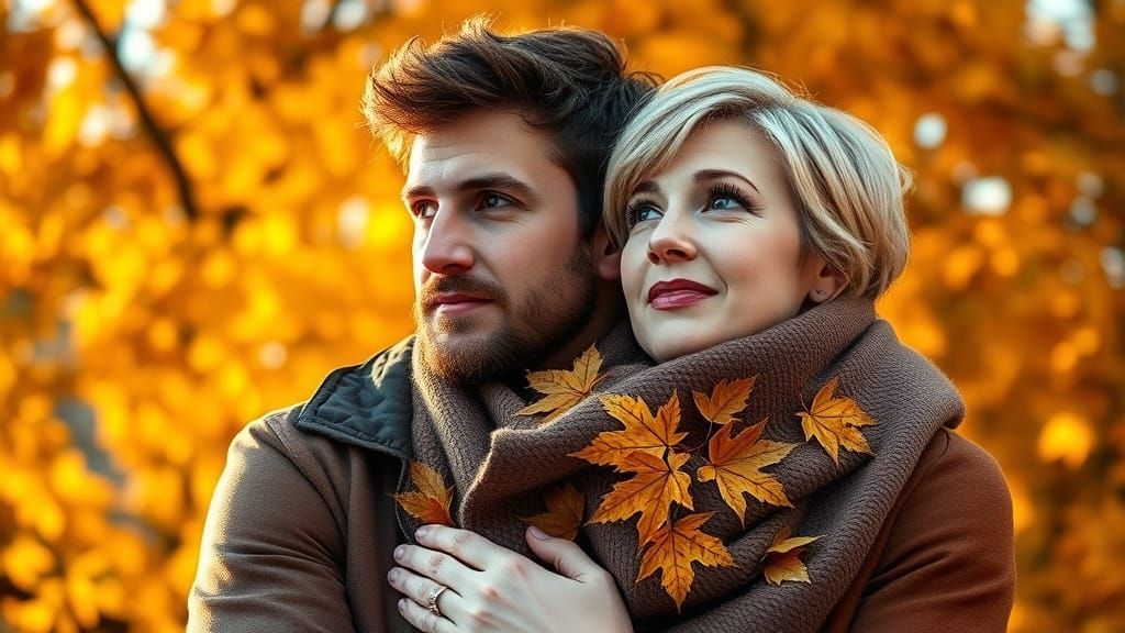 A photorealistic medium close-up of a couple embracing during golden hour. The woman wears a scarf with golden maple leaves, and a ring is visible on her hand, set against a vibrant autumn backdrop.