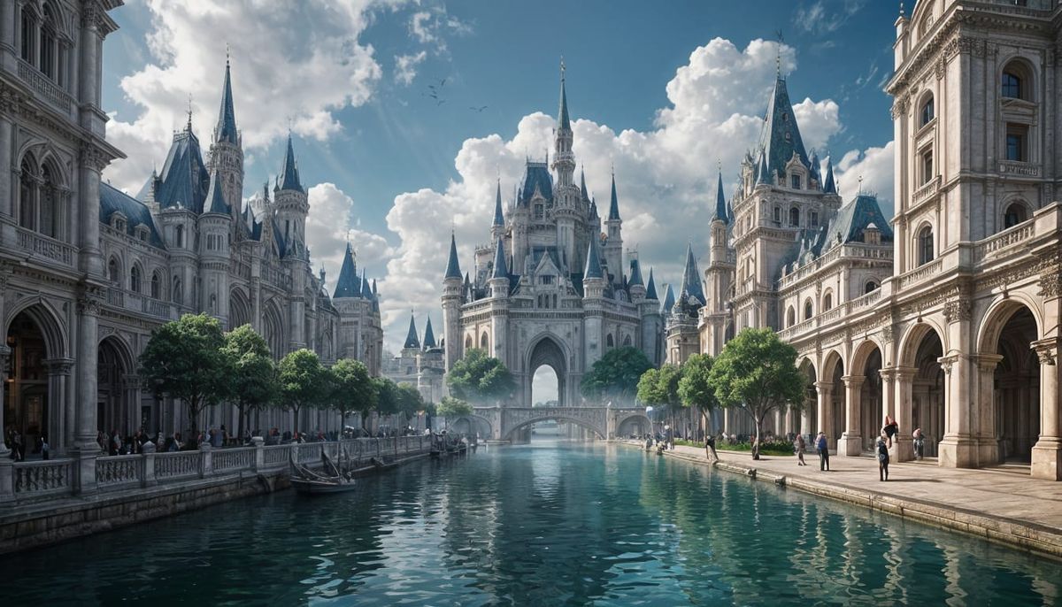 This image depicts a breathtaking fantasy city featuring towering white marble palaces and bustling streets. A serene river reflects the intricate details of the magnificent structures under a blue, cloud-filled sky. Rendered as detailed digital concept art.
