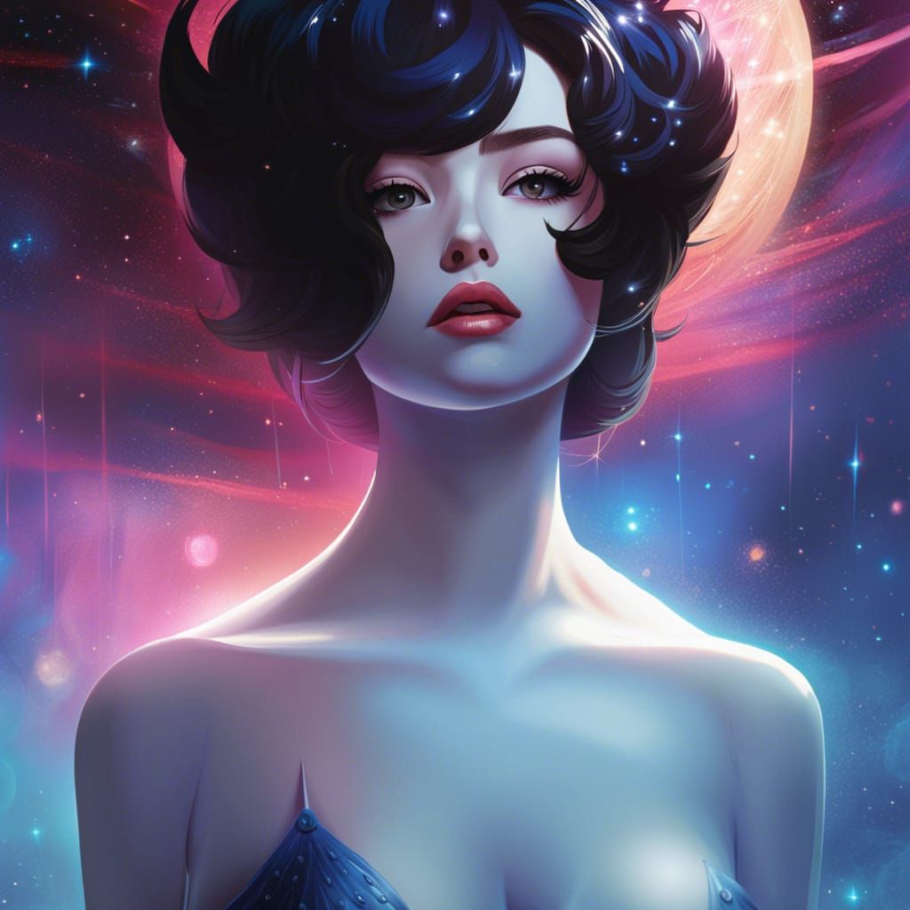 Beautiful anime girl with short black hair, inside her are universes and stars, character portrait