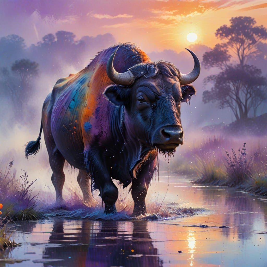 Generate your own vibrant watercolor splashes of water buffalo at sunset with our free AI tool.