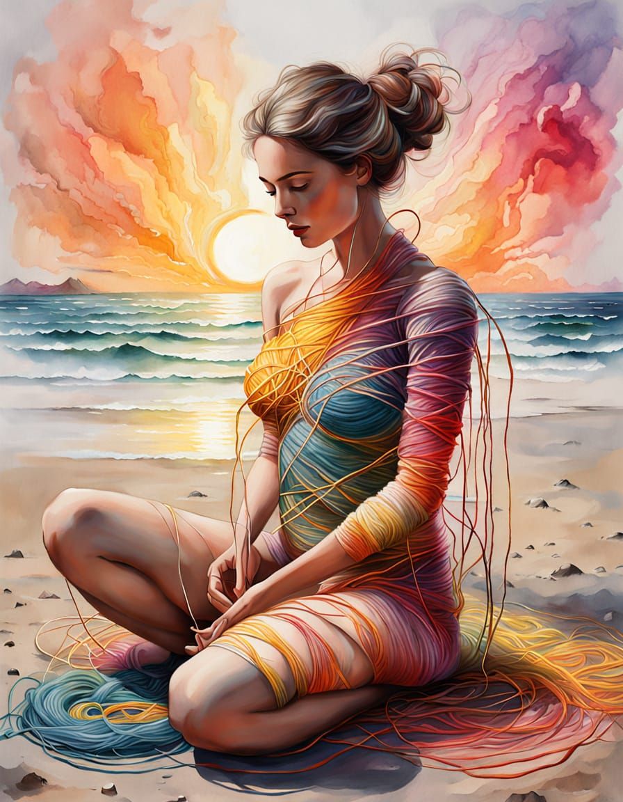 An oil painting in a graffiti and watercolor style shows a woman knitting her own yarn body. The scene is a dreamlike beach at sunset with glowing mist.