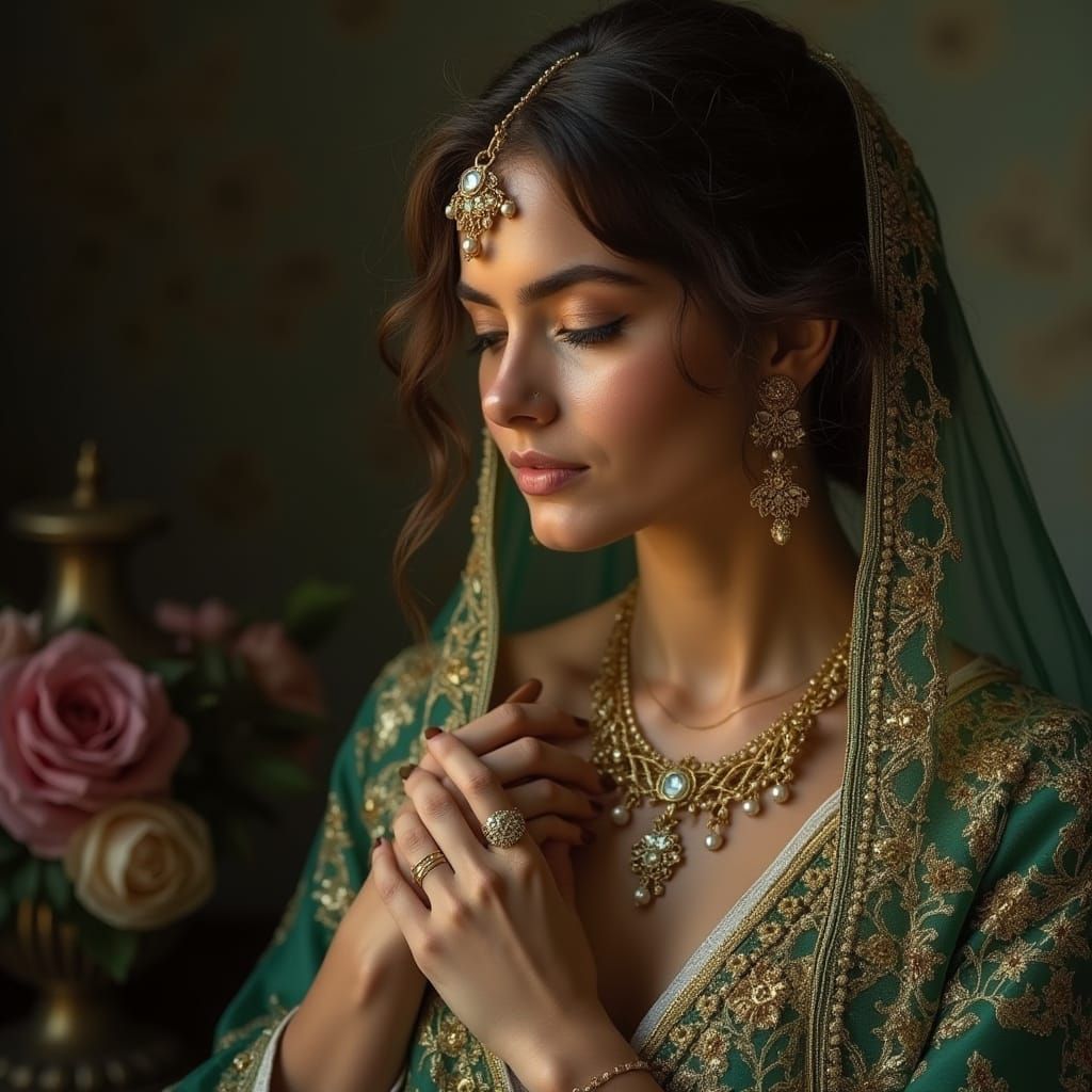 Uma pintura a Γ³leo em estilo hΓbrido de Jean-LΓ©on GΓ©rΓ΄me e EugΓ¨ne Delacroix. Uma linda mulher libanesa protegida em um leito ornamentado com tecidos orientais, envolta por luz suave e sombras douradas. Seu perfume Γ‘rabe parece flutuar no ar, envolvendo o ambiente em desejo e sonho. Um objeto antigo aleatΓ³rio ...