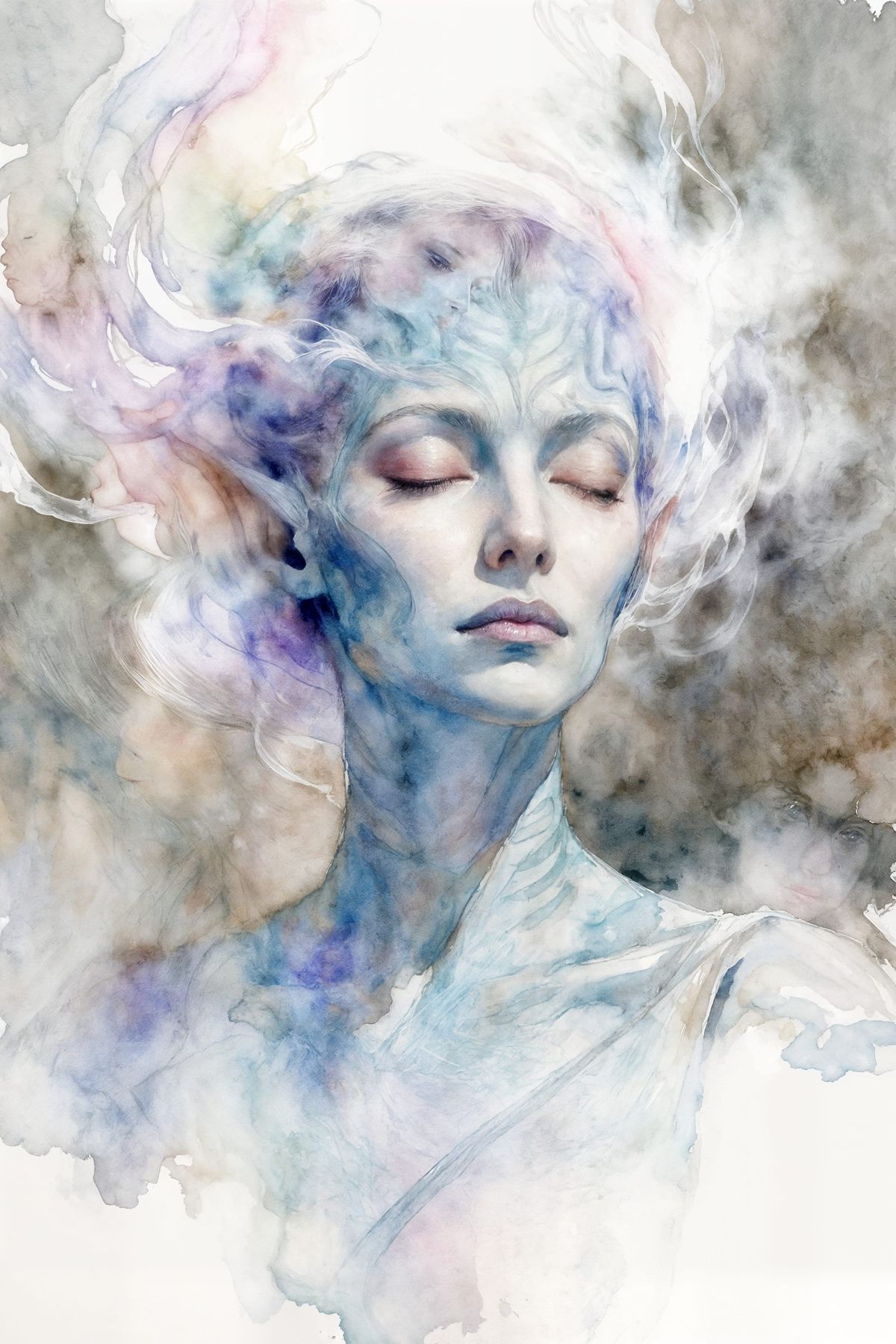 This image shows a beautiful Vulcan woman in a misty portrait. Soft watercolor techniques and pastel colors create a dreamlike, hazy halo and a sense of a fleeting memory.