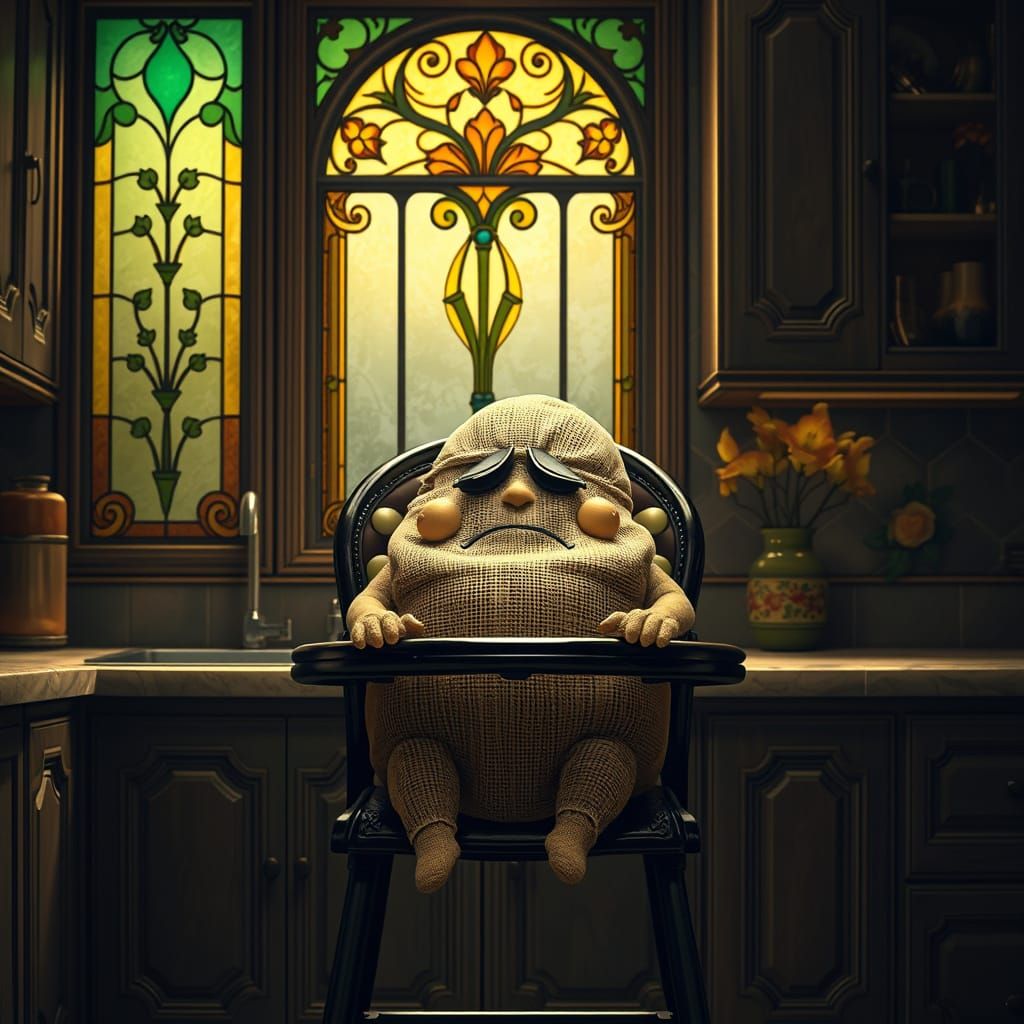 This hyper-realistic image shows a sad potato sack in a highchair within an art nouveau kitchen. Ambient light highlights burlap texture and floral motifs, creating a melancholic yet whimsical mood.