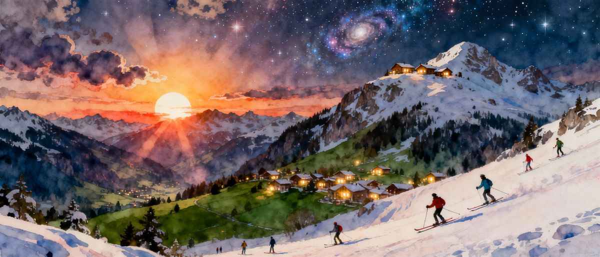 A vibrant AI-generated landscape depicting the Swiss Alps at sunrise. Features snowy peaks, green valleys, illuminated villages, and skiers, rendered with sharp colors and dramatic lighting.