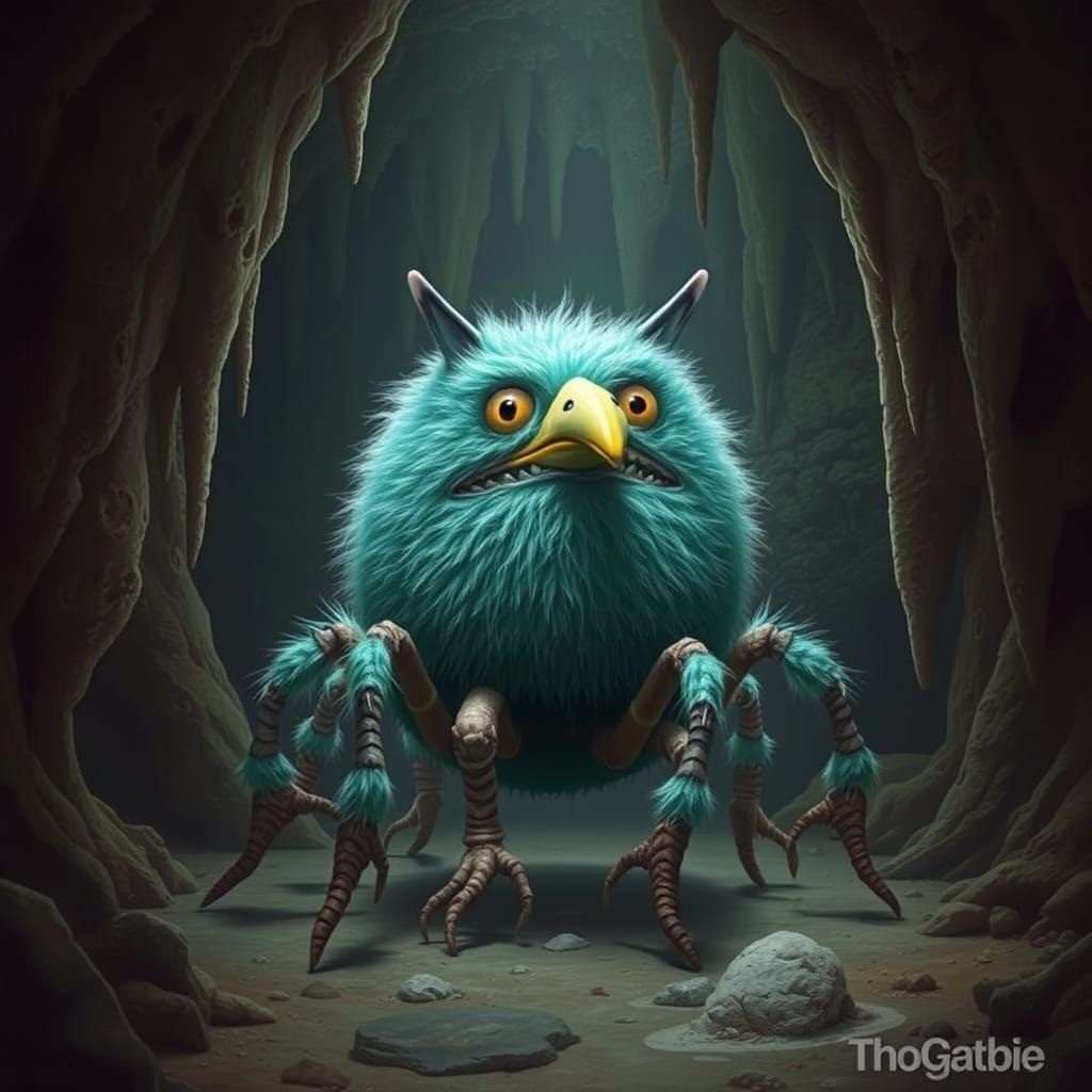 This image shows a bizarre turquoise monster with spider legs and mismatched features, sitting in a cave. The scene features muted colors and eerie lighting, in a biomechanical science fiction style.