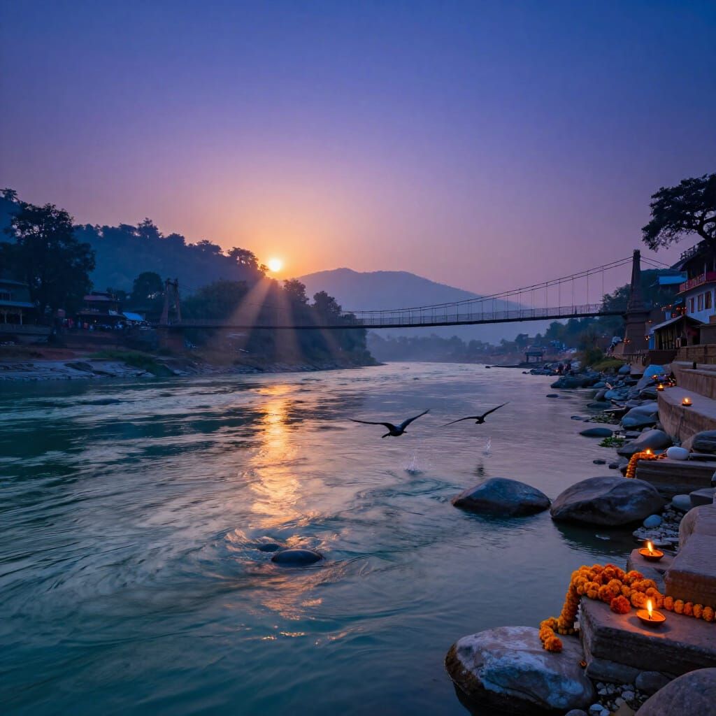 A photorealistic cinematic view of the sacred Ganges in Rishikesh at twilight. Features a deep blue-violet sky, glowing sunset, and turquoise river reflecting serene Himalayan foothills and a suspension bridge. Spiritual atmosphere with floating garlands and diyas.