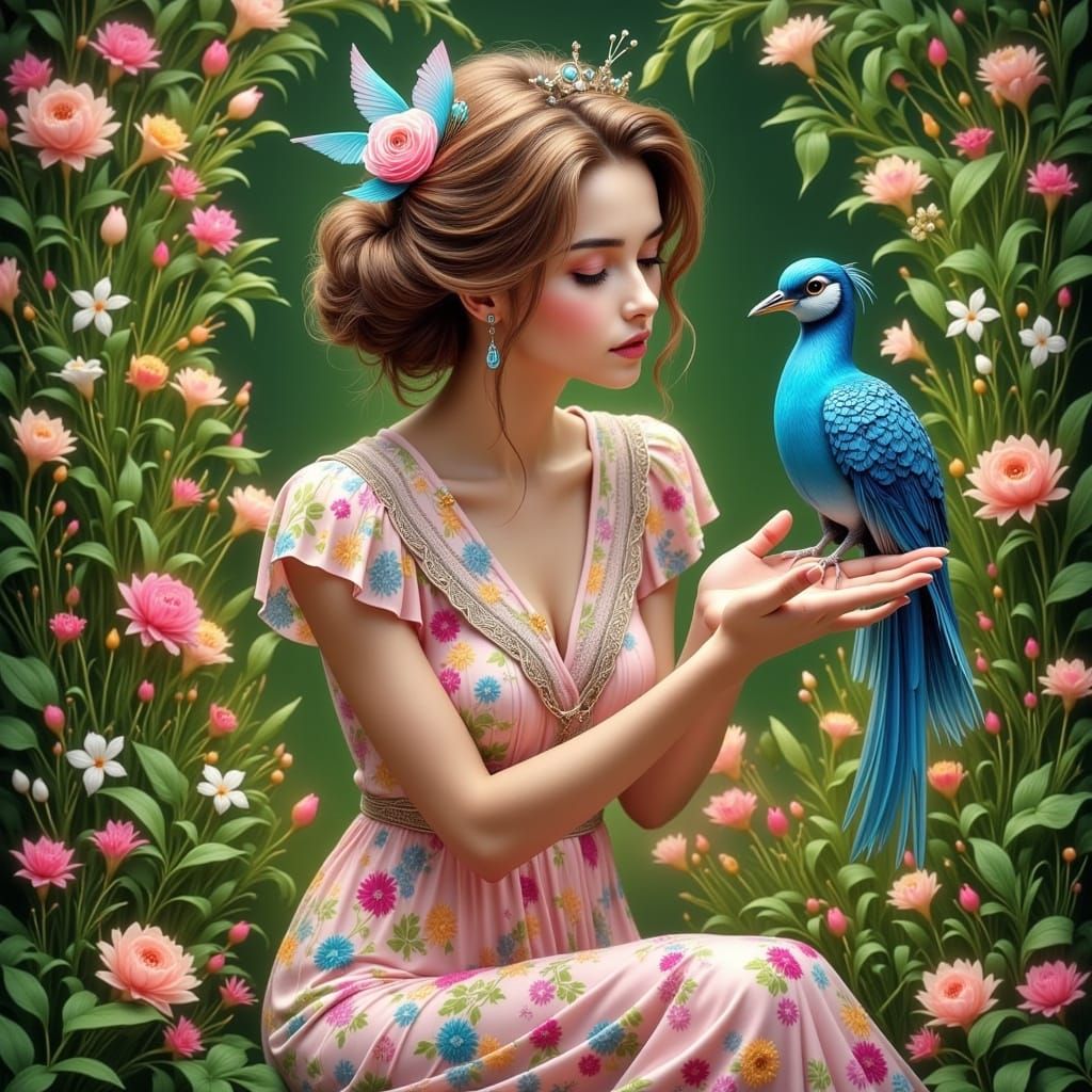 This image showcases a beautiful, glowing European woman seated in a lush garden, surrounded by vibrant colors and delicate floral patterns. She holds a stunning blue bird with iridescent feathers, exuding a sense of serene beauty.