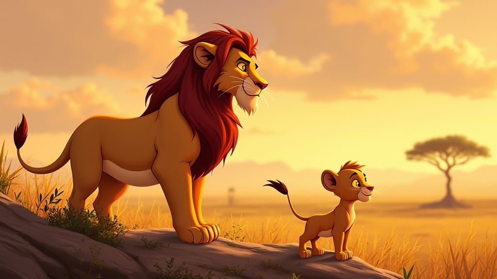This image shows a stylized animated scene of young lion cub Leo and his mother Queen Malaika overlooking the African savannah. The artwork features bold lines and earthy tones.