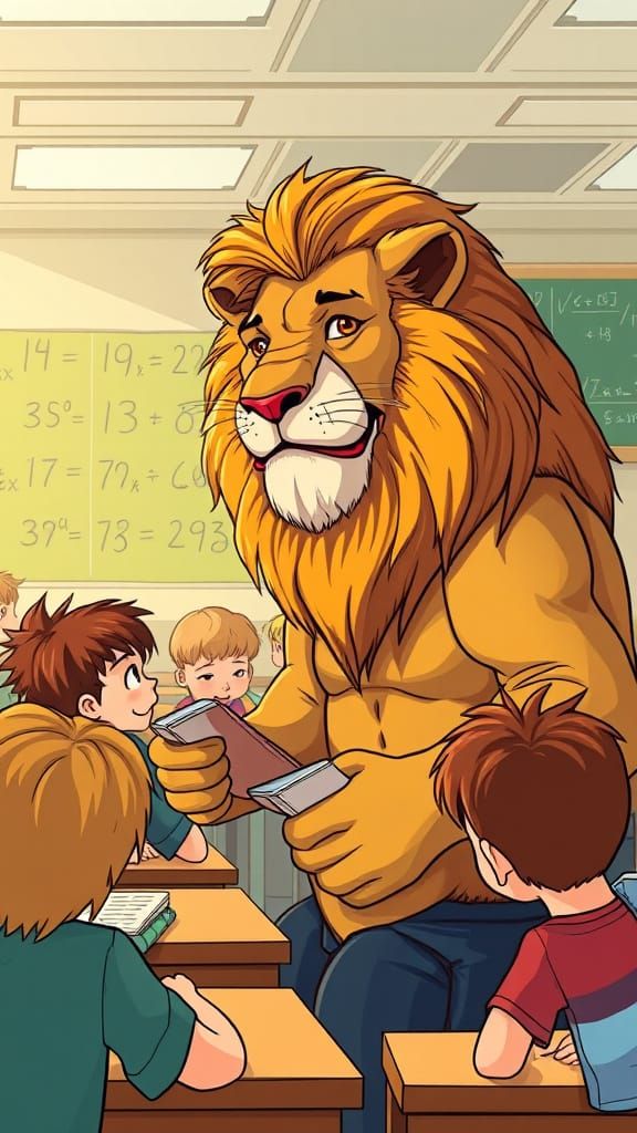 This image shows a cartoon lion, a kindly teacher, instructing a classroom of children in mathematics. The scene is rendered in a smooth, vibrant comic book art style.