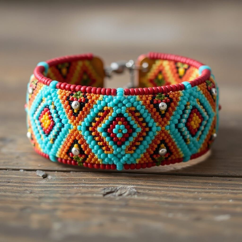 A vibrant seed bead bracelet with a complex geometric design in turquoise, crimson, and amber. Softbox lighting enhances the texture in this high-contrast image, reminiscent of beaded jewelry art.