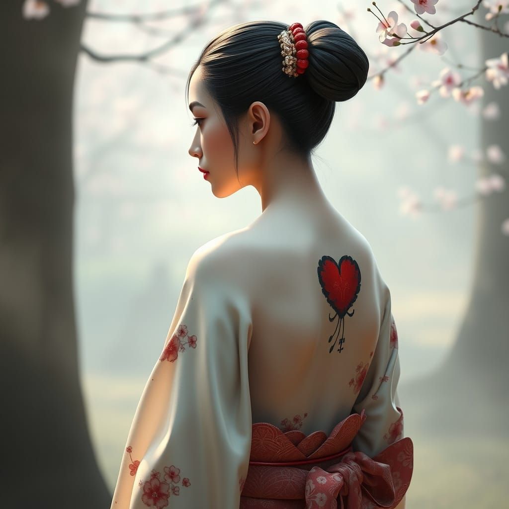 This image features a serene, misty garden scene with a traditional Japanese woman in a kimono, adorned with intricate cherry blossom patterns, and a bold, worn heart tattoo on her back, rendered in 3D with subtle shading and deep shadows.