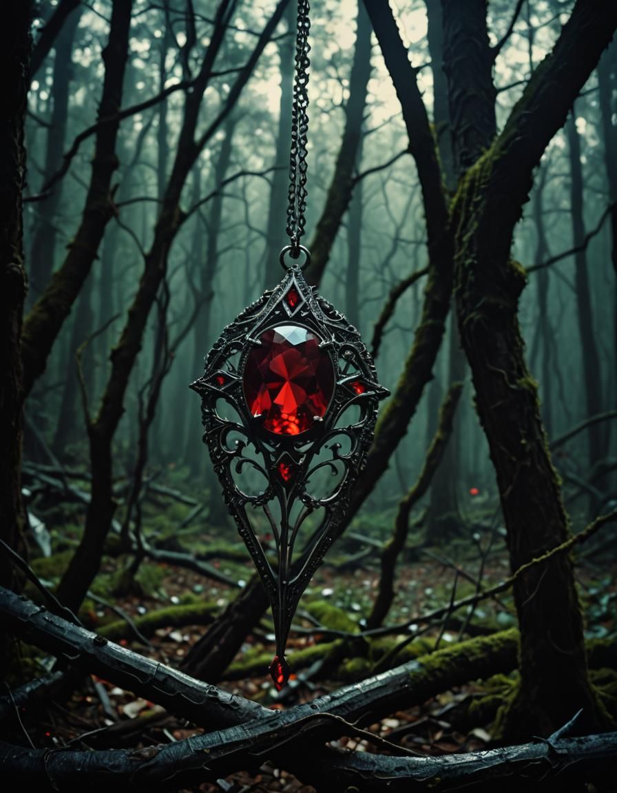 A dramatic, cinematic image of a thin, red jewel called 'The Vampire's Kiss'. The post-processed film still features film grain, vignette, and atmospheric, cinematic lighting.