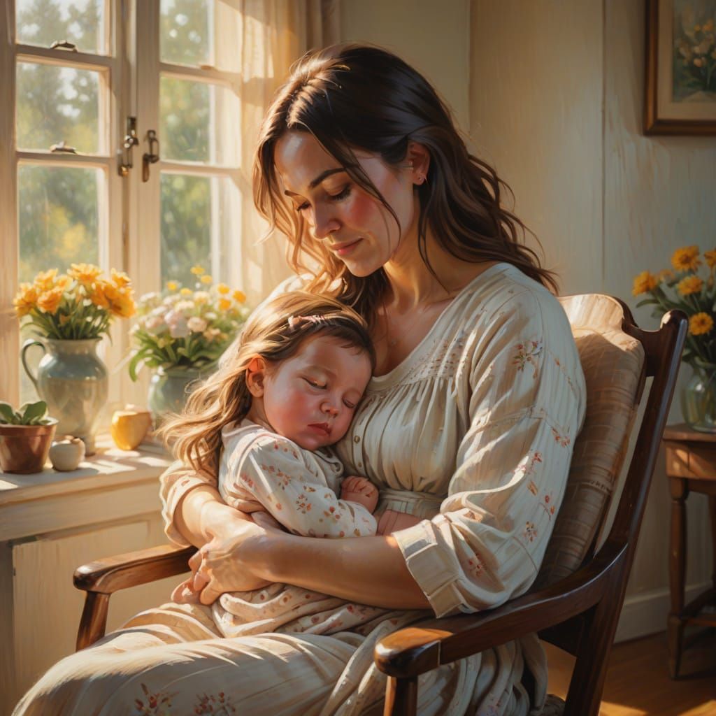 A heartwarming image captures a young mother cradling her infant in a rocking chair by a window. The soft focus, warm lighting, and pastel colors evoke a serene, intimate atmosphere as an oil painting.