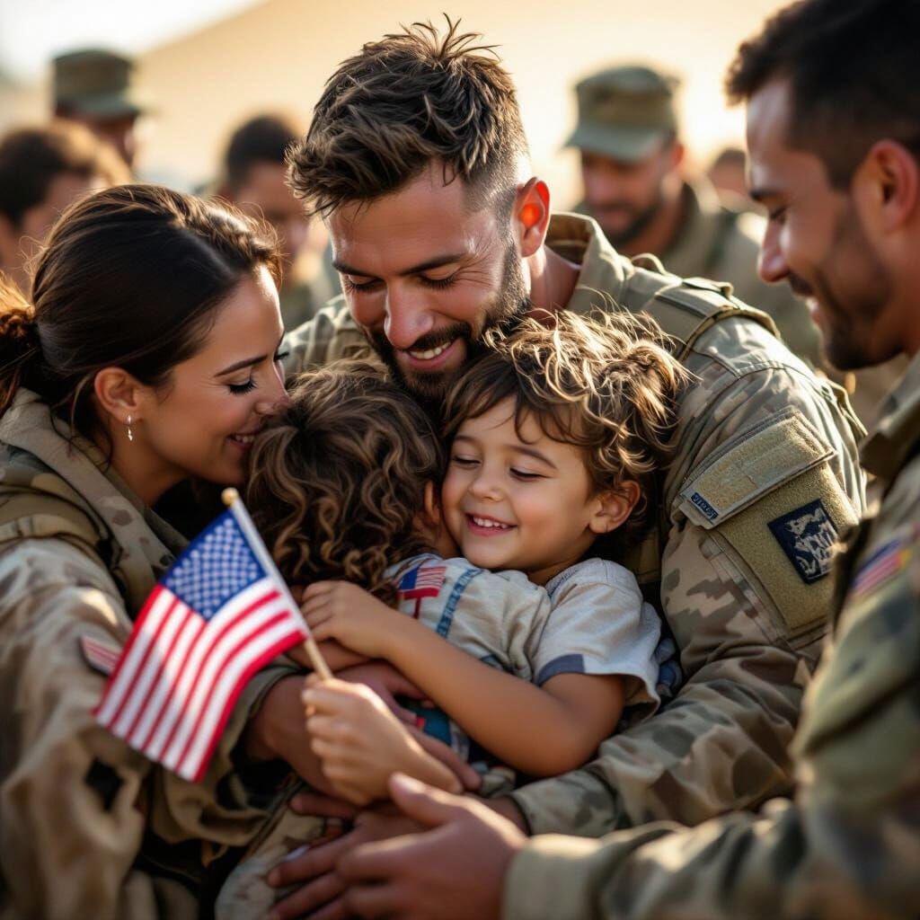 This image shows a soldier in uniform hugging his child at an airport, as his wife looks on with tears of joy. The emotional scene evokes a cinematic and realistic style.