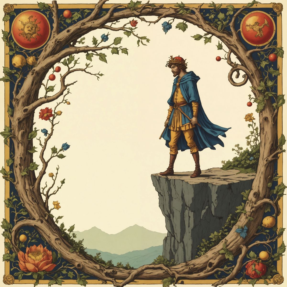 This image shows a medieval-style tarot card depicting the Fool. The card features a decorative border, enhancing its traditional aesthetic and mystical appeal.