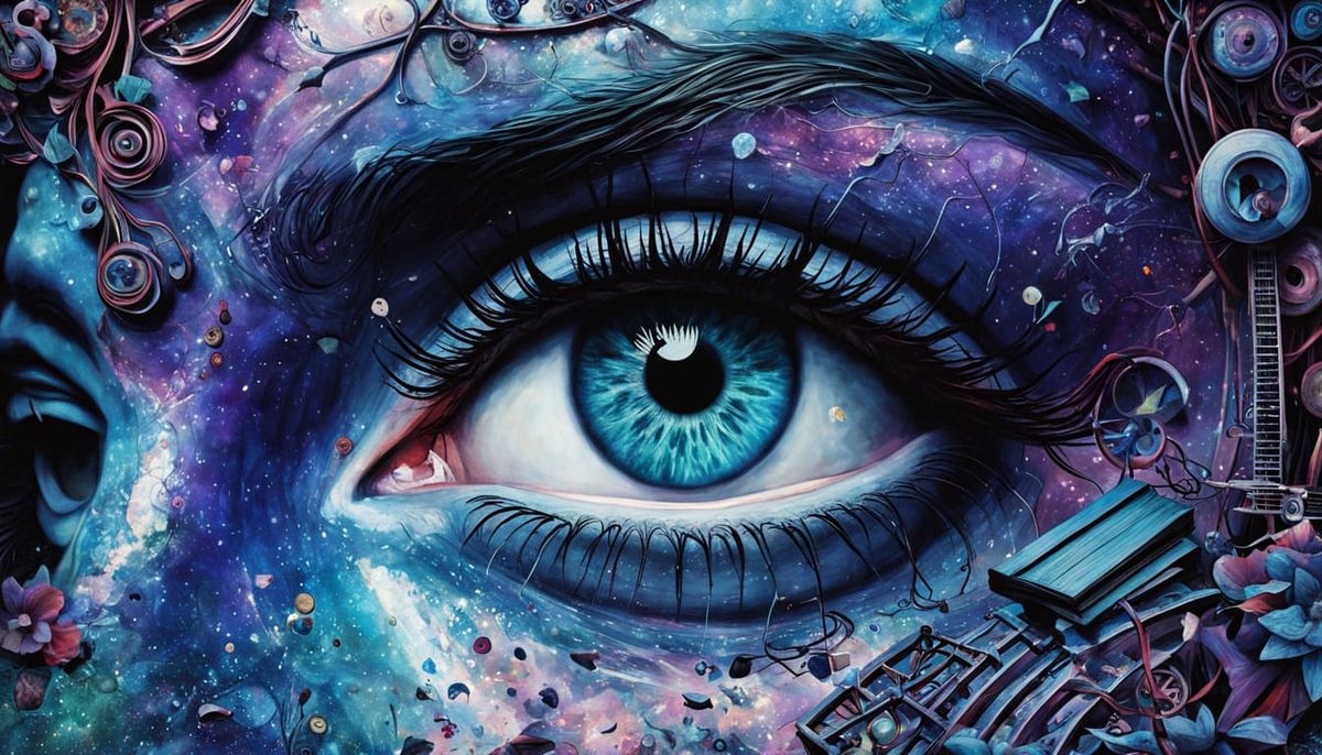 This digital artwork depicts a mesmerizing cosmic landscape with a central figure surrounded by a textured network and serene nature scenes. The artwork represents the intersection of human connection with nature and the cosmos, incorporating elements of strength, resilience, and the hidden realms.