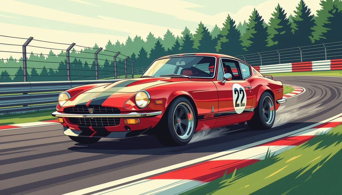 A dynamic image of a red retro-modern sports car speeding on a wet racetrack. The artwork blends dynamic linework and vivid colors in a hand-drawn comic book style.
