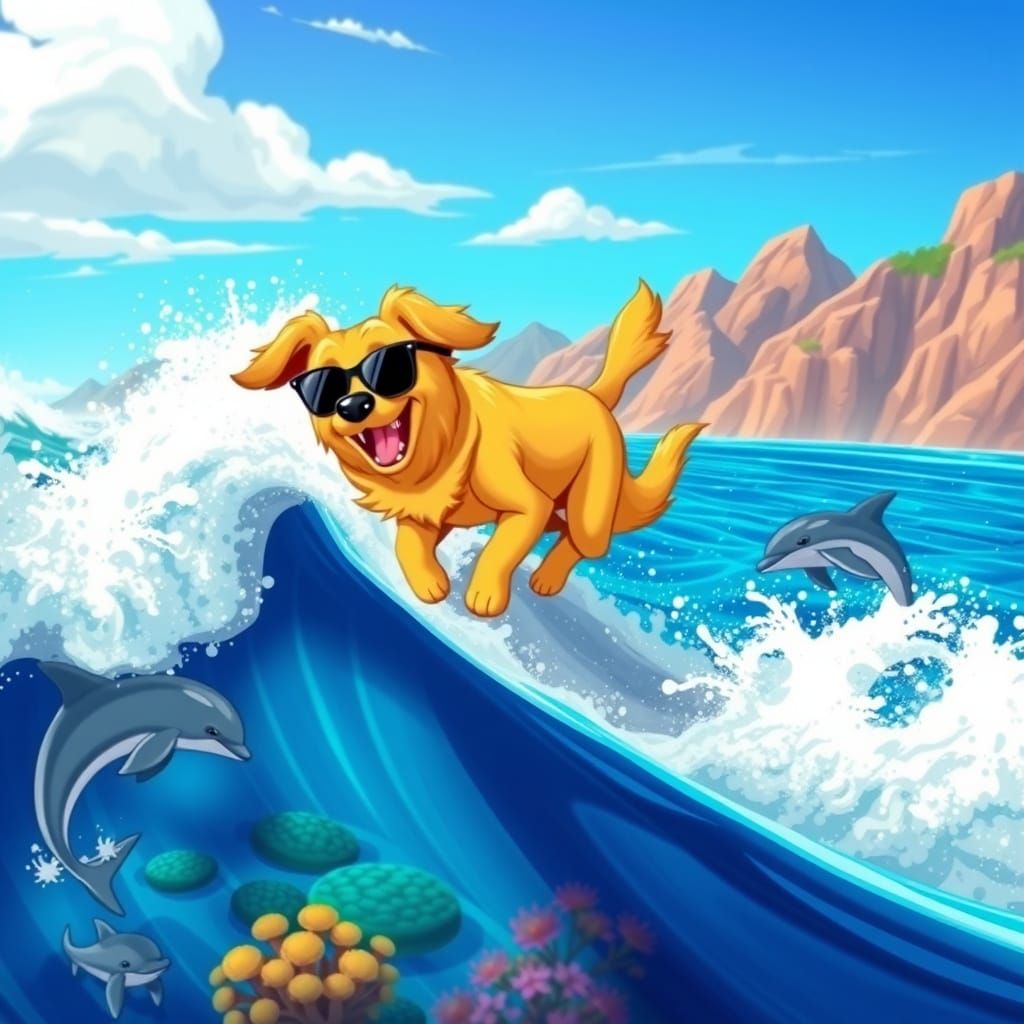 This image captures a joyful golden retriever in sunglasses, riding a massive wave above a vibrant coral reef teeming with marine life, in a whimsical cartoonish style reminiscent of Disney and Pixar.
