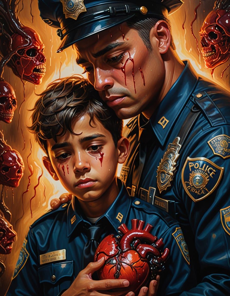 This image shows an American police officer holding an anatomical heart next to a crying Hispanic boy. The surreal oil painting features glowing bioluminescent tears and warm golden lighting, creating an emotional and mystical scene.