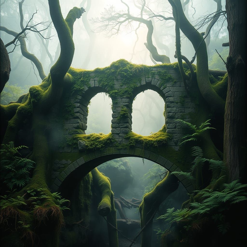 This enchanting image depicts a mist-shrouded stone bridge, bursting with lush greenery, set amidst a primeval forest bathed in soft, emerald light, with intricate textures and vibrant colors reminiscent of a museum-quality masterpiece, rendered in thick, layered gouache and watercolor.