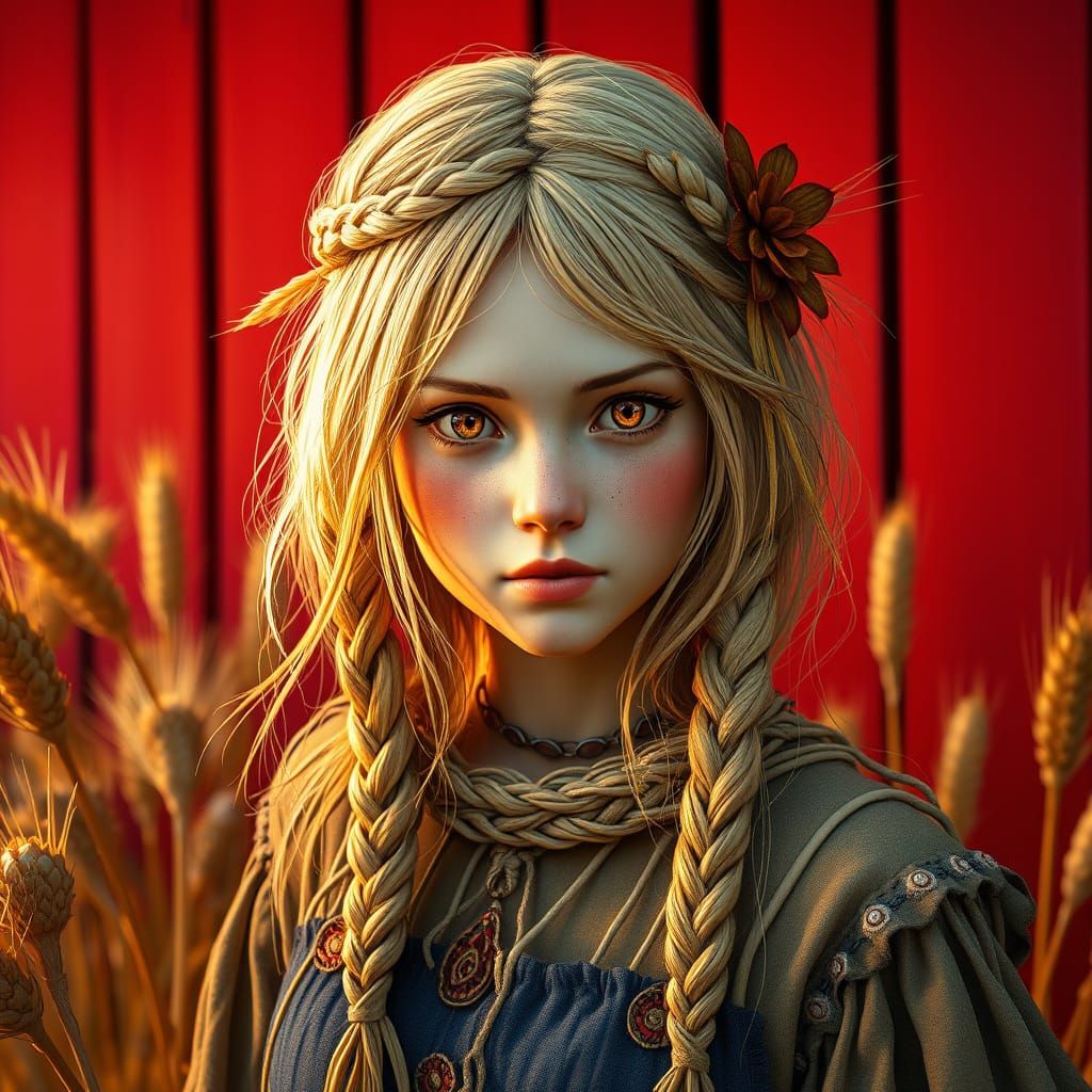 This image shows a beautiful straw-haired girl with intricate braids and wheat adornments, set against a warm autumn backdrop in a vibrant Art Nouveau style, blending organic textures and dynamic lighting.