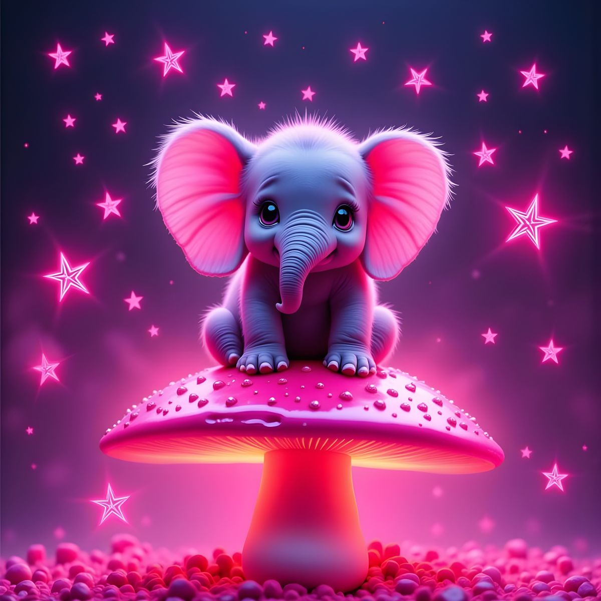 This image features a tiny, adorable baby elephant with expressive eyes, sitting on a mushroom. The scene is bathed in a vibrant, glowing pink aesthetic, with scattered pink stars.