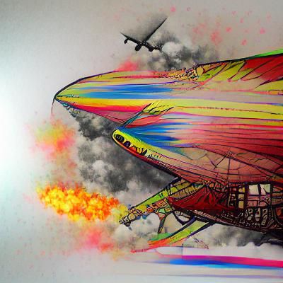 This image shows a zeppelin engulfed in flames plummeting from the sky. The 8k resolution drawing features vibrant colors and an ink-based aesthetic.
