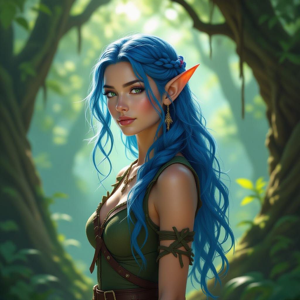 This image depicts a realistic portrait of a female elf druid with striking blue hair, set in a sun-dappled ancient forest. Rendered with hyperrealistic detail and cinematic lighting, it evokes fantasy concept art.