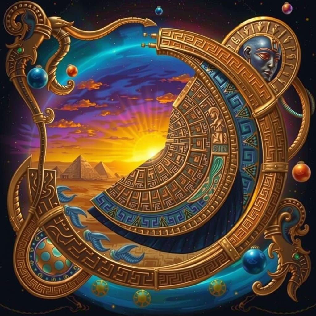 A majestic pharaoh in golden attire stands amidst swirling auroras, evoking ancient Egypt with pyramid silhouettes. The image blends retro-futurism with intricate, mystical details.