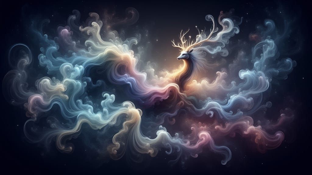 This image shows a majestic stag formed from a swirling cosmic nebula, filled with stars and galaxies. It features iridescent colors and a sense of infinite space, presented as detailed digital art in a cosmic style.