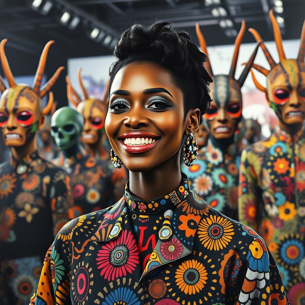A striking picture of a vibrant woman with a bright smile wearing patterned clothing, surrounded by models in a fashion show. The image is rendered in a gouache style with thick brush strokes and layered watercolors.