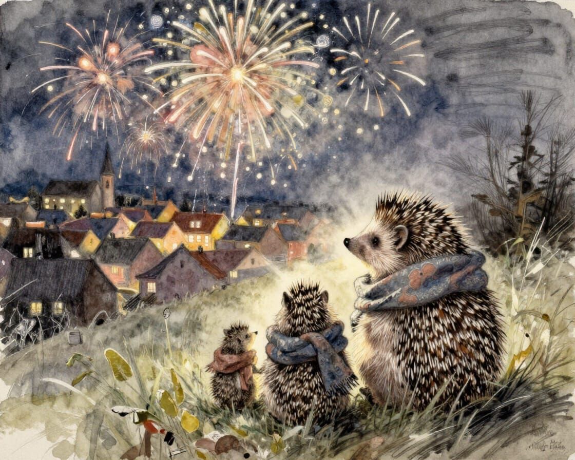 This image shows a hyperdetailed sketch of a hedgehog family in scarves watching fireworks over a village. Rendered in a gentle, painterly gouache and watercolor style with thick brush strokes.