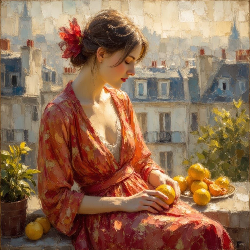 This image shows a woman on a Paris rooftop in warm sunlight, her robe falling open. Rendered in a vibrant, impressionistic style with earthy tones and flowing lines, it features a hazy cityscape.