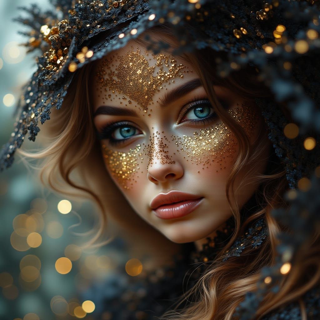A striking image of a woman with blue eyes and gold glitter on her face, peering through a lace veil. The soft lighting and ornate details evoke a dreamy, ethereal aesthetic.