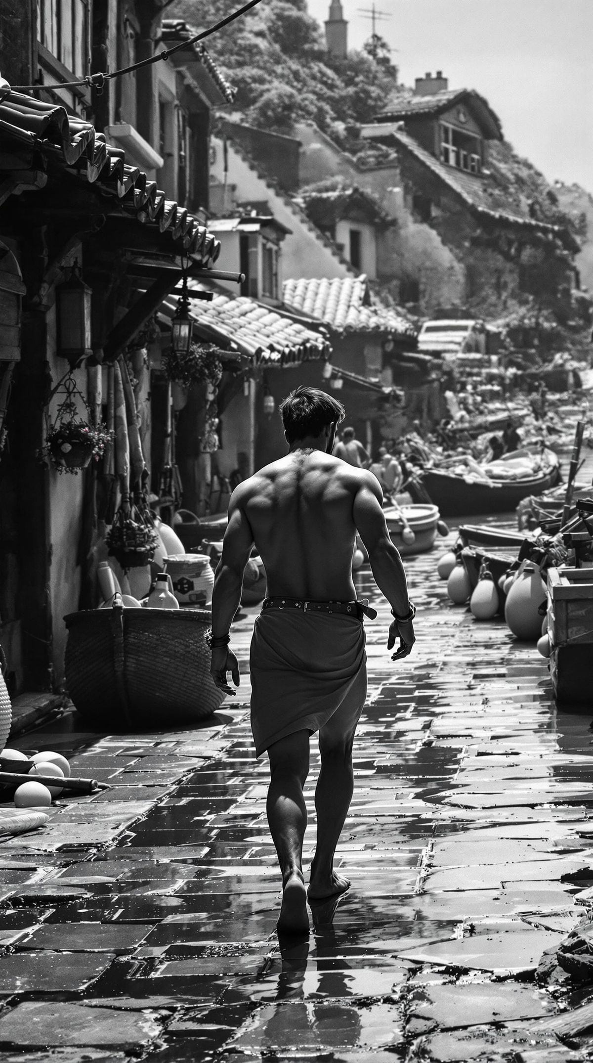 This image shows a barefoot prince with a muscular physique in a monochrome, photorealistic harbor village. It features dramatic lighting and striking contrasts, capturing a cinematic quality with a shallow depth of field.