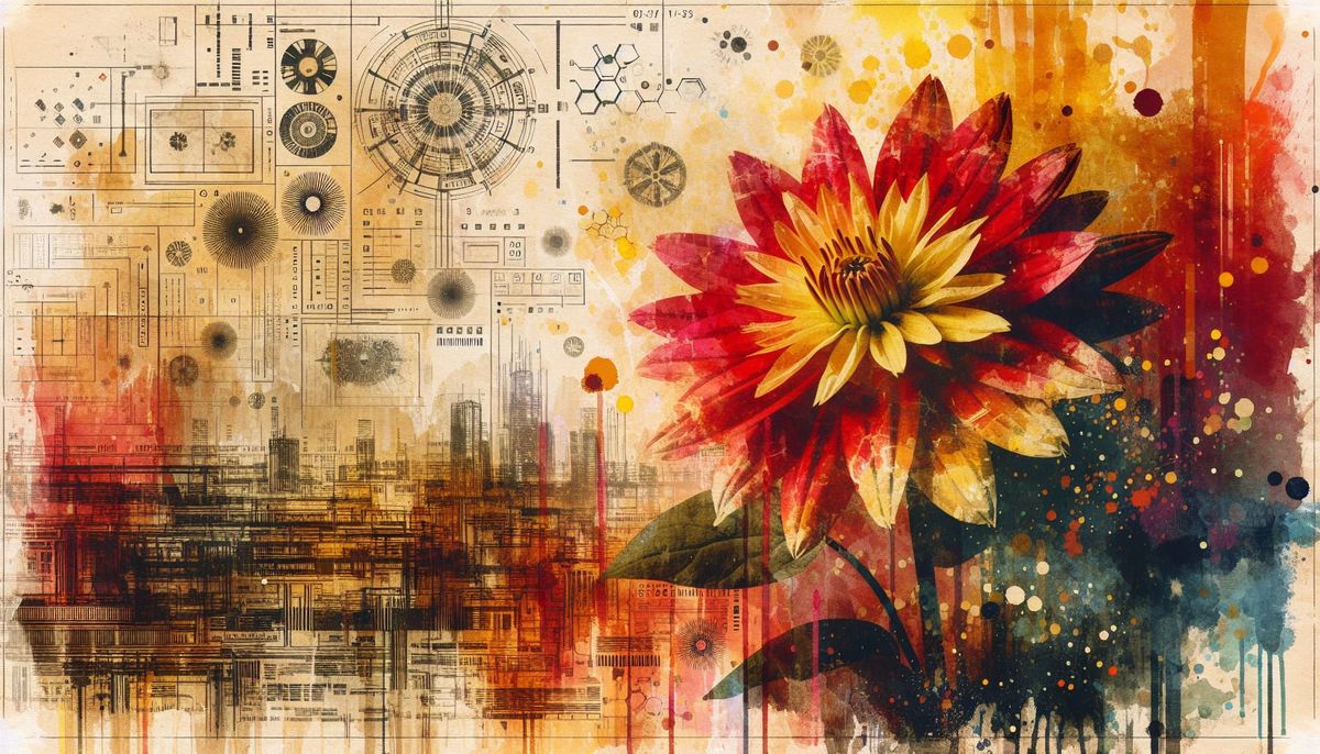 A surreal double exposure of a flower against an alien city. The image evokes a vintage watercolor painting with warm, abstract colors and textured printing defects, creating a poetic collage.