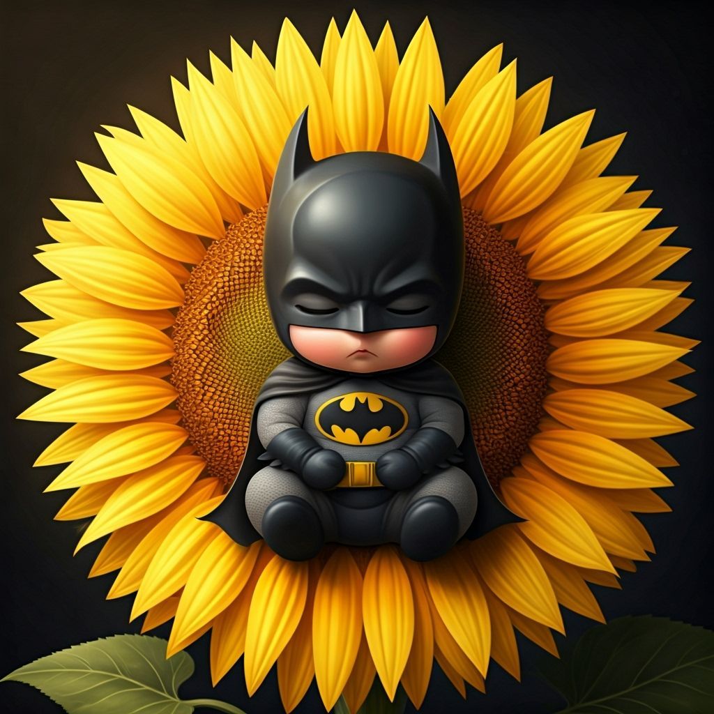 This image shows a baby dressed as Batman sleeping peacefully on a sunflower. The scene is rendered to emphasize the innocence of the child superhero.