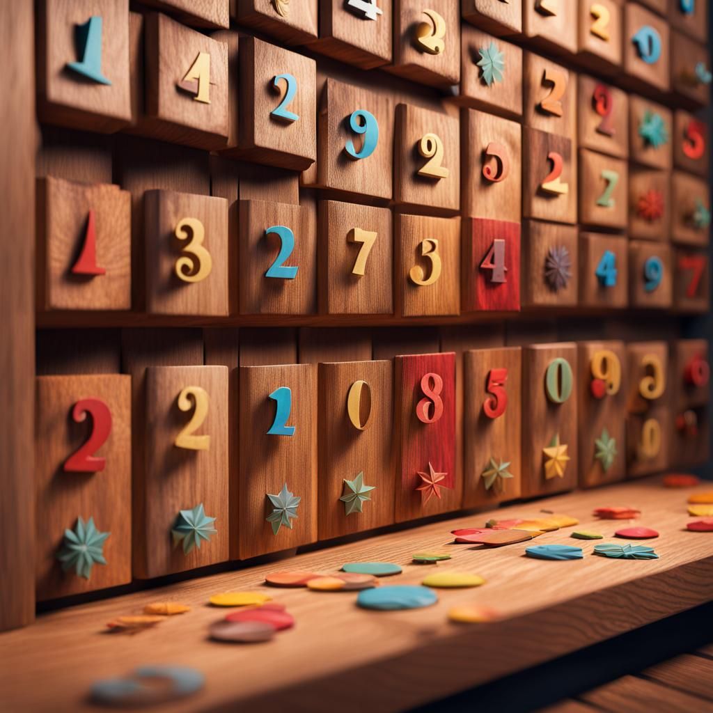 A hyperrealistic advent calendar crafted from wood. The image features intricate details, vibrant colors, and dramatic lighting, presented as digital splash art.